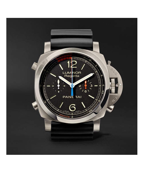 Almost everything Officine Panerai engineers today is based on the same principles as the watches the brand used to supply to the Italian navy. The 47mm diameter case and oversized numerals of this 'Luminor 1950 Regatta' reference, for example, mirror those worn by divers so they could read the time underwater at a glance. It's powered by a precise P.9100/R automatic mechanical movement and housed in titanium for its ability to stand up to everyday use. Switch out the rubber strap with the leather one in the box for days at the office. We offer a two year warranty for all working parts and any manufacturing faults. - tMovement - Swiss-made P.9100/R calibre automatic mechanical movement with 3-day power reserve - 37 jewels, 28, 800 Vph - Glucydur® balance wheel, Incabloc® anti-shock device tFunctions - Hour, minute and small seconds hands - Date window - Seconds reset - Flyback chronograph: hour and seconds counters - Regatta countdown tDial - Black dial, white and orange minute track, luminescent Arabic numerals and indices, luminescent, blue and orange hands tCase - Brushed titanium case - Polished titanium fixed bezel - Screw-in crown with protective shield for time adjustments and manual winding - Scratch-resistant corundum sapphire crystal - Sapphire crystal case back - Buckle-fastening black rubber strap tSpecifications - Case diameter: 47mm - Water resistance: 10 bar - Comes in a presentation box with additional black leather strap, plastic protector, five suede elastic, interchangeability tool, screwdriver and instruction booklet - Reference number: PAM00526 - Manufactured in Switzerland