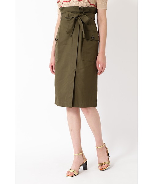 品よくカジュアルダウン出来るタイトスカート。ミニヘリンボーンの織り柄がはいった生地を使い、洗い加工などで程よくラフに仕上げて大人感を出しています。縁にゴールドカラーの入った釦も、ミリタリーテイストになりすぎない上品なポイントです。ウエストやヒップラインがほっそり見えるラップ風の巻きデザインに、脚がですぎないスリットを入れた歩きやすいデザイン。共布のウエストリボンは、肩結びでラフな着こなしがオススメです。