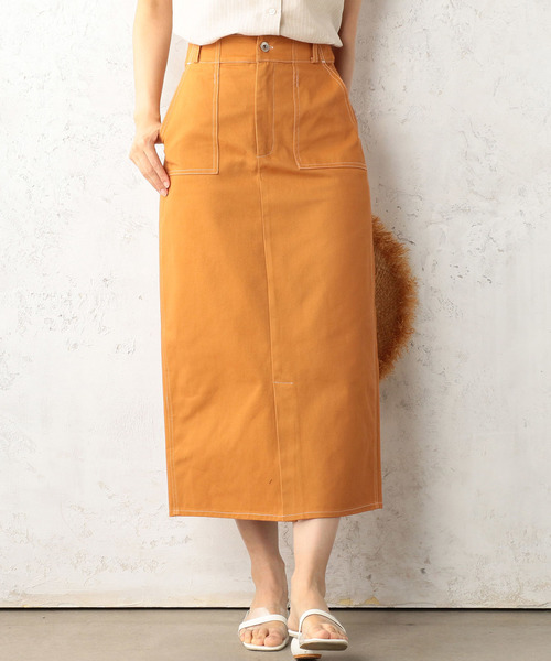 バイカラーのステッチ配色が可愛いタイトスカート。 長めのタイトでも深めのスリットが入り、動きやすい仕様に◎ コットン生地のさらっとした着心地も魅力です。 Tシャツやカットソーはもちろん、ブラウスできれいめな着こなしもおすすめです♪