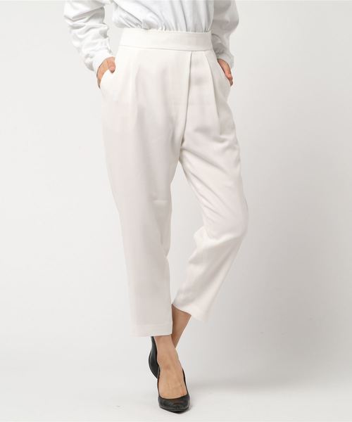 ラップ風デザインが旬なスタイルを演出してくれるテーパードパンツ。 ゆったりシルエットながらタックを施し、綺麗なシルエットを創り出してくれます。 バックウエスト部分はゴム仕様で、リラックス感のある履き心地も魅力的。 普段使いからオフィスシーンまで活躍出来るアイテムです。