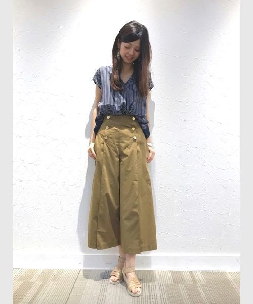 フロントの金ボタンがアクセントのマリンパンツ。ワイドなシルエットとハイウエストが今っぽく、旬の着こなしを叶えてくれます。 バックウエストはゴム仕様なので、リラックスした穿き心地なのもうれしいポイントです。
