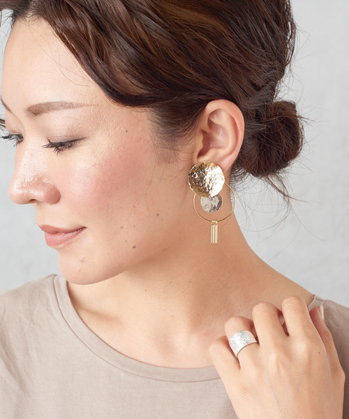 ハンドメイド風の表情違いのプレート2種とリングを組み合わせたイヤリング。 大きめのプレートからリングとプレートの両方を下げてエレガントに揺らしたり、 リングを外して2種のプレートだけのシンプルさも楽しめます。 スタイリングに合わせて2WAYに楽しむことのできるアクセサリーです。 ■サンプル撮影商品■ こちらの商品はサンプルでの撮影となっております。 実際の商品とは、商品情報(一部使用、納期など)が変更になる場合がございます。 予めご了承ください。