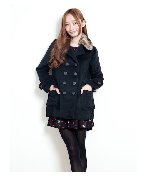 ふんわりシャギー素材のファー付きWコート。ミックスカラーのフェイクファーを衿にあしらって、メンズライクな今年らしいデザインをガーリーにしました。バックルの位置でぬけ感バランスの後ろ姿も可愛らしいですね。サテンの裏地に星柄を織り込んでイーハイフンらしさを表現。※裏地あり