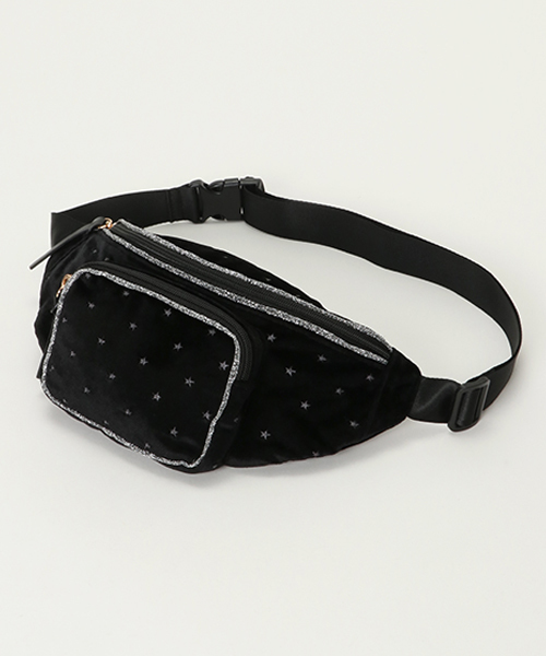 【WEB限定】今季も引き続きトレンドの「ベロア」を使ったウエストポーチ。小さな星の刺繍が散りばめられ、ラメ糸のパイピングもキラキラ可愛い!マチ付きの外ポケット、背面にもファスナーポケットが付いた便利な仕様。もちろん、内ポケットもしっかり付いています。イチ早く取り入れて、コーデのポイントにしたいアイテム!!