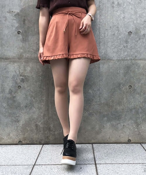 ~NICECLAUP 2018 summer Collection~ ■ナイスクラップで人気の裾フリルショーパンにnew ver.が登場! 人気の裾フリルショーパンがブラッシュアップ!細ベルトがセットになった程よく大人見えするデザインに。 裾広がりになっているので脚もすっきり見え、ウエストマークの効果で脚長効果も◎ ウエスト後ろが太めのシャーリングゴムになっているのでフィット感が高く、かつ履きやすいのも魅力。 ポケットも付いて機能的です。 ■スタイリング ブラウスやレーストップス、オフショルダートップスでオンナっぽくコーデして。 ボーダーやロゴTなどのカジュアルトップスやスウェットにも好相性◎ スニーカーとも相性がよいのでアクティブに動くこれからの季節にもぴったり。