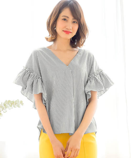着るだけで女性らしさ漂う“フリル切り替えVネックブラウス”【素材】少しのシャリ感とハリ感のある素材がきれいなシルエットをキープ。薄手の生地が涼し気な1枚です。【デザイン】袖に施したフリルデザインは、コーディネートに取り入れるだけでアクセントとなり、女性らしさ漂う1枚。ボリュームのあるスリーブデザインなので、華奢見えが叶うのも嬉しいポイントです。ネックラインは前後Vネックで大人見えし、抜け感もプラスします。