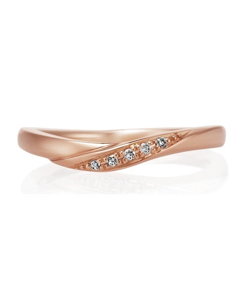緩やかなV字ラインで中央にひねりを加え、ダイヤモンドを5石施したデザイン。手元を綺麗にみせてくれるおすすめのデザイン。ピンクゴールド素材の温かみのある輝きが女性らしいリング。 Men's品番:111346442252 *サイズ直し可能(±2号) 付属品:ジュエリーケース
