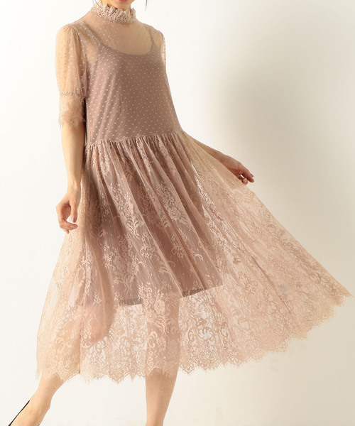 ■レース使いが贅沢なハイネックワンピース■トップはドットレース、スカートは花柄のレースと2種類をドッキングしたレースワンピース。 ペチコートとしてインナーキャミがついているので透けにくく1枚で着ていただけます。 インナーが短めなので裾部分の透け感が軽やかな印象に。 デニムと重ねてボヘミアンな雰囲気で着こなすのもオススメです。 ぺチコート付き(ペチコートは本体から取り外し可能です。)