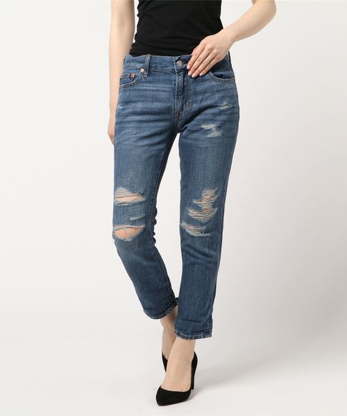 ライトウェイトのプレミアムデニム フェイド加工とウィスカー加工の施されたダークインディゴウォッシュ ボタン留め、ボタンフライ 5ポケット スタイル 全体にダメージ加工のディテール入り ロールダウンできる裾 *商品タグに記載の価格とサイト上の販売価格が異なる事があります。