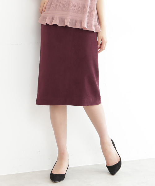 曲線美が引き立つタイトスカート。定番のピーチフェイクスウェード素材を使用、秋カラーが品の良い仕上がりです。ウエストのくびれやヒップまわりをほっそり見せてくれる、今年らしい膝丈のタイトシルエットです。きれいめブラウスやカットソーを合わせた、通勤スタイルにお勧めです。※裏地有り・スリット有り
