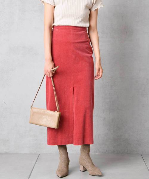 スタイルアップが期待できるハイウエスト仕様のシンプルなシルエットが魅力のタイトスカート。 薄手で細畝のコーデュロイでビンテージライクな表情に仕上げました。 縦長のIラインシルエットで、フロントに入れた深めのスリットがカジュアルな中にも女性らしい雰囲気をプラスしてくれます。 暑い時期はカットソーと、秋にはざっくりとしたボリュームニットと合わせるなど幅広いコーディネートで活躍してくれます。