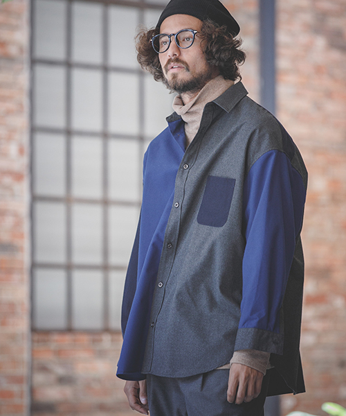 181cm 66kgのモデルがMサイズを着用ビッグシルエットかつクレイジー切り替えで個性的な要素満載のシャツ。アウターのようにパーカーやインナーの上から羽織る事ができ、シャツジャケットのような扱いが可能です。個性的な切り替えパターンですが落ち着いたトーンで決して派手になりすぎず、スタイリングの邪魔をしないので、どんなスタイルにも相性抜群です。日本製※着用画像と商品単体画像で色が異なる場合がございます。※商品単体画像を実物により近づけております。