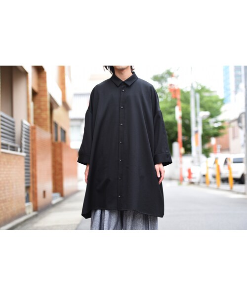 手触りの良い高級感のあるツイルウールクロスを使用したビッグシャツ。 男性はビッグシャツとして、女性にはシャツワンピースとして着用いただけます。 袖にはボタンが付いており、外すと肩から大きなスリットに。 レイヤードも楽しめる一着です。 ロング丈なので羽織としても◎
