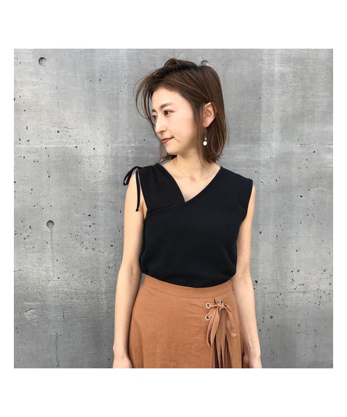左肩の異素材使いと、ドロストリボンの仕様がポイントのTOPS。 身頃は程よく肉厚のカットソー素材でカジュアルになりすぎず、きれいめボトムとも相性の良い1枚です。