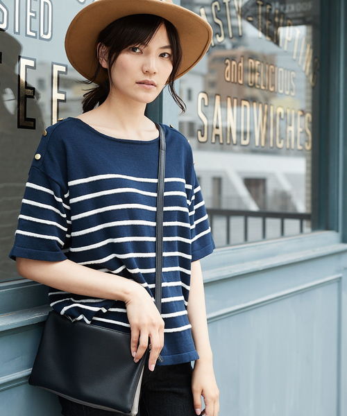 肩の金ボタンがマリンルックなアクセントとなるボーダープルオーバー。広めのネックラインがデコルテをきれいに見せてくれ、女性らしさを一層引き立ててくれます。 どんなボトムとも相性のいいボーダートップスは、トレンドに左右されず長く愛用できる優秀な1枚です。