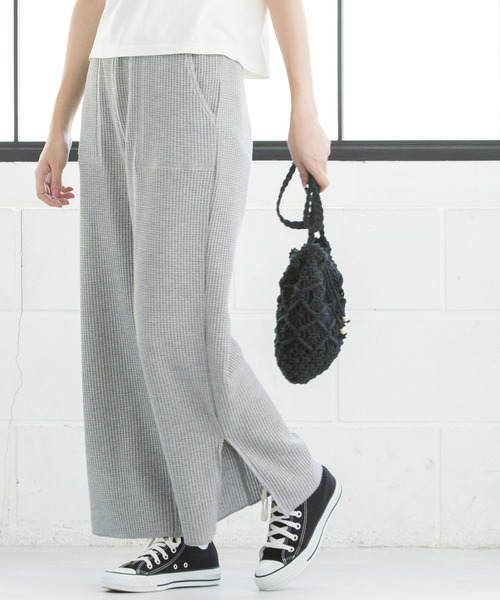 大胆なスリットデザインがアクセントに 肌触りの良いワッフル素材で仕上げたパンツ。サイドに施した大スリットデザインが、手軽に着こなしのアクセントになります。 ストンとした落ち感のスタイルよく見えるラインにこだわりました。 人気のハイウエスト仕様で、トップスをインした際にウエスト周りのシルエットが綺麗に見えるひと品。 ウエストはゴムになっており、リラックスして快適に着用頂けるのも嬉しいポイント。 今季はショート丈トップスと合わせたり、ベレー帽やチョーカーなど、小物で遊びを効かせたコーディネートもオススメです。