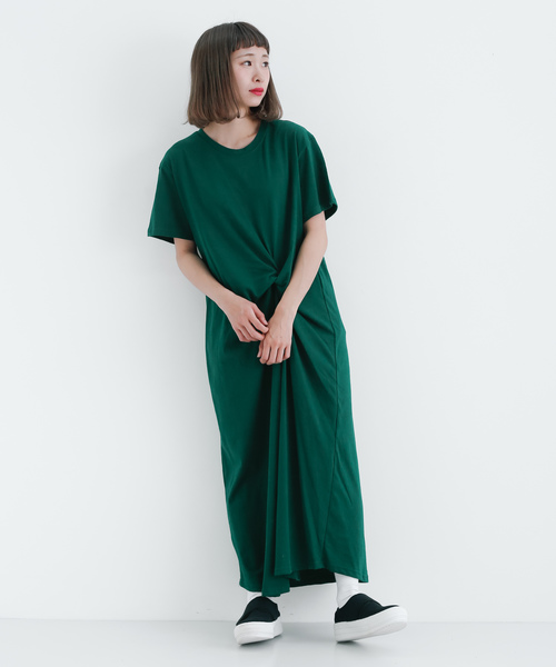 シンプルなストレートシルエットのロング丈Tシャツワンピース。ウエスト部分のツイストのドレープが女性らしくデザイン性の高い一枚。一枚でワンピースとして着たり、デニムとレイヤードしたカジュアルスタイルがおすすめです。