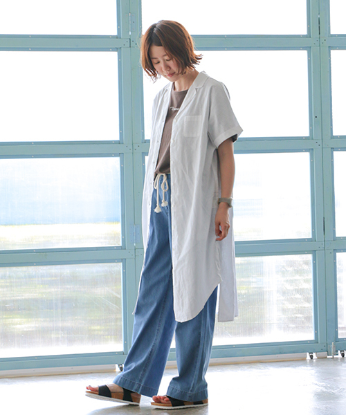コーディネートの要になってくれるシンプルなデニムワイドパンツ。 やわらかくて履きやすいデニム生地を使用しているため、夏でも気軽に履いて頂けます。 マリンな気分のロープ紐付がベルト代わりのポイントに♪ ウエストINの着こなしも様になります。 [クリーニング] 洗濯機洗い可(弱く)、ドライクリーニング可(F)、ウェットクリーニング(W)