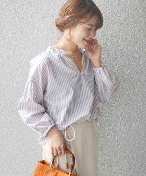イタリアCangioli社の生地を使用した上品なブラウス。袖のボリュームや、ギャザーがアクセントになった大人な可愛らしさのあるデザイン。コーディネートの主役になってくれる1枚です。 ※末永く愛用頂く為に、アテンションタグ・洗濯ネームを必ずご確認の上、着用又はお取り扱い下さい。 ※画像の商品はサンプルです。 実際の商品と仕様、加工、サイズが若干異なる場合がございます。 ※屋外での撮影画像は、光の当たり具合で色味が異なって見える場合があります。商品の色味は、スタジオでの詳細画像をご参照ください。
