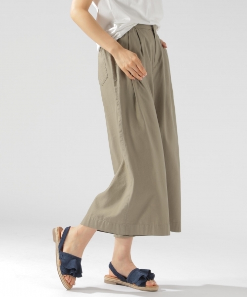 バックサテンを使用した2タックのワイドパンツ。 きれいめな見た目ながら、薄手で柔らかな風合いが特徴。 ウエストの後ろ部分はゴム使いしており、穿き心地もらくちんです。 トップスの合わせ次第で、表情を変えて着回せるはず。