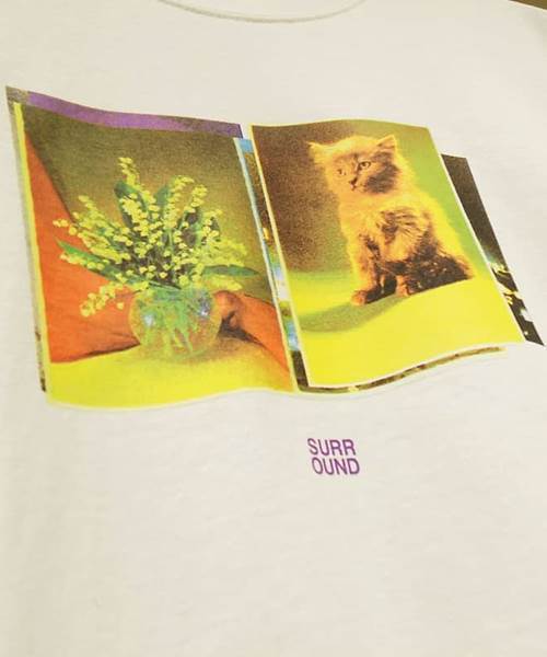 GOOD OL’/グッドオルのデザイナー福田健太郎と、アートディレクター永戸鉄也による新レーベルSURROUND/サラウンドより2018A/W新作が入荷!胸元に猫とフラワーベースがプリントされたクルーネックTシャツ。ほどよい厚みの生地は汗をよく吸ってくれるので、暑い季節の不快感を軽減してくれます。着心地のいい脇線の縫い目がない仕様。オープンカラーシャツの下に着たり、Tシャツの重ね着でコーディネートにメリハリをつけたりと何枚でも持っていたいアイテムです。【GOOD OL'/グッドオル】“旧き良きもの”“信頼のおけるもの”という意味を持つスラング。ストリートでは、チャカ(銃)を指す形容詞として使われている。洋服に限定しても何を指して“GOOD OL'”だなと思うかは人それぞれ。デザイナー自らが“GOOD OL'”だと思うものを洋服に落としこんでリリース。ただ旧いものをまねるわけではなく、カルチャーという裏付けをもって洋服を構築しています。【永戸哲也】国内のトップアーティストのジャケットデザインやミュージックビデオのディレクション、〈UNDERCOVER(アンダーカバー)〉や〈KIJIMA TAKAYUKI(キジマタカユキ)〉といったブランドのブックディレクションなどを手がけるほか、昨年行われた〈sacai(サカイ)〉と〈UNDERCOVER〉のショーのドキュメンタリークリップのディレクションも手がけた人物。コラージュ、写真、映像作品を制作するアーティストとしても活動している。