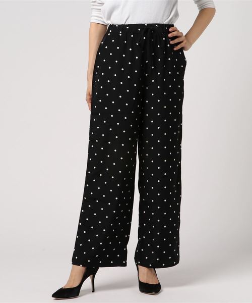 レトロ感のあるドット柄イージーパンツ。 小さ目のドット柄はコーデを選ばず、着回しやすいアイテム☆ ウエストは総ゴムなのでノンストレスで着用可能♪ 裏地付きで透ける心配もなし! PN18SS-154 ドット柄開襟シャツとセットアップでの着用がオススメ◎