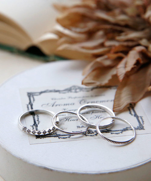 小さなストーンのリング、サンド加工のリング、シンプルなリング・・・など、さまざまな素材感を楽しめるリングのセットです。 ひとつひとつが華奢で、重ね付けをしても品のある女性らしい手元に。 クセのない使いやすいデザインなので、お手持ちのリングをプラスしても◎