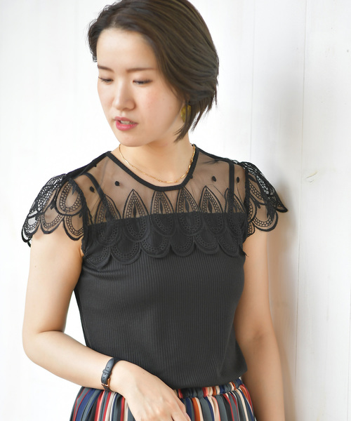 大胆レースでゴージャス見え♪ 大きなしずく柄の刺繍レースが胸元を大胆に彩るプルオーバー。 胸元と肩に大人っぽい透け感を作り出したゴージャスなムード漂うアイテムです。 身頃は伸縮性の良いテレコカットソーでラフにご着用いただけます。 エレガントなデザインなので結婚式や二次会、パーティーなどにもピッタリ♪ 裏地なし カットソーのみ伸縮性あり 薄手 洗濯:洗濯機使用可(ネット使用)