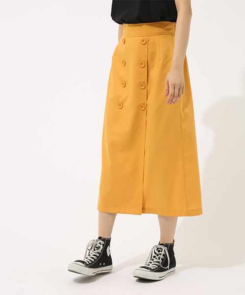裾に向かってすっと広がるシルエットが大人カジュアルな雰囲気を演出するツイルトレンチスカートです。ほのかな光沢感、フロントのダブルボタン、ラップ風デザインなどにも、さりげなくこだわりが覗きます。リラックスマインドなはき心地がうれしいバックウエストゴム仕様です。