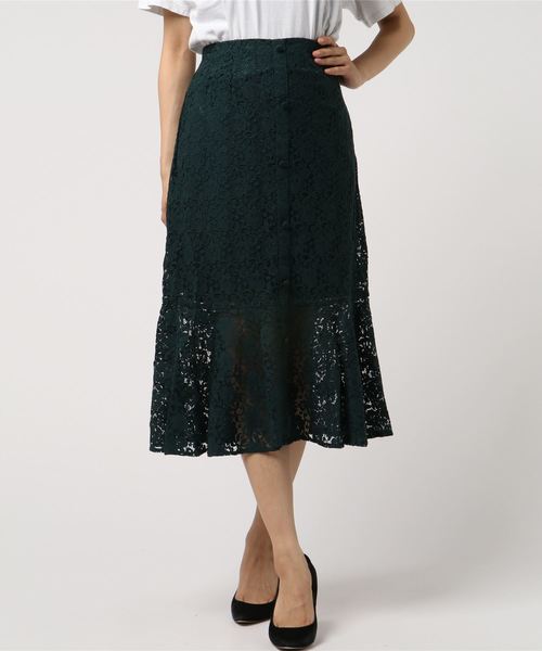 ■レディな印象のマーメイドスカート■ 人気のレーススカートにマーメイドタイプが登場。 ひざ下のシアー感が今っぽく、軽さを出してくれます。 カラーも定番のモノトーンと深みのあるグリーンの3色です。 コーディネートのマンネリを解消したい方、他と差をつけたい方にオススメです♪