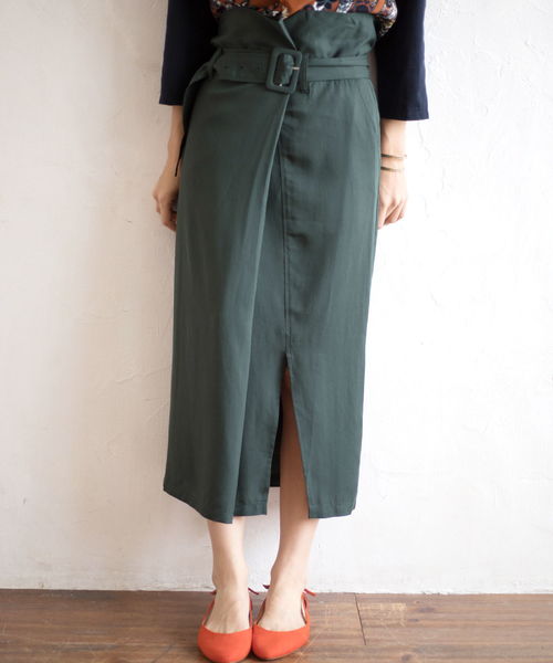 ハイウェストのラップ風タックナロースカート。微光沢のあるリヨセル地は、さらりとひんやり感もあり秋立ち上がりから取り入れやすい素材です。ウェスト部分が折り返せるデザインなので、トップスをインして着るスタイルがおすすめです。