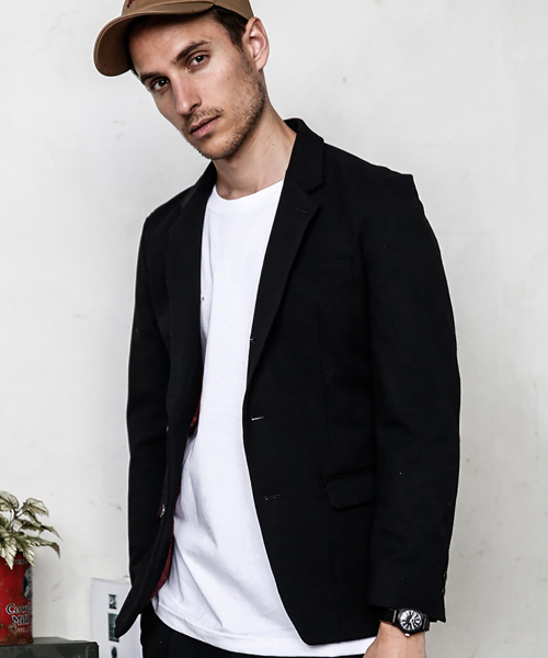 インビスタ社のサーモライト(高機能保温素材)を使用したストレッチ素材。型はノッチドラペル&ローリングダウン(段返り)の3つ釦でクラシックアメリカンの定番。シルエットやラペルの細さなどでモダンにウェアラブルしたジャケット。。ロゴ刻印を焦がしで入れた本水牛ボタンを使用。同素材のパンツも製作していてセットアップにもなります。