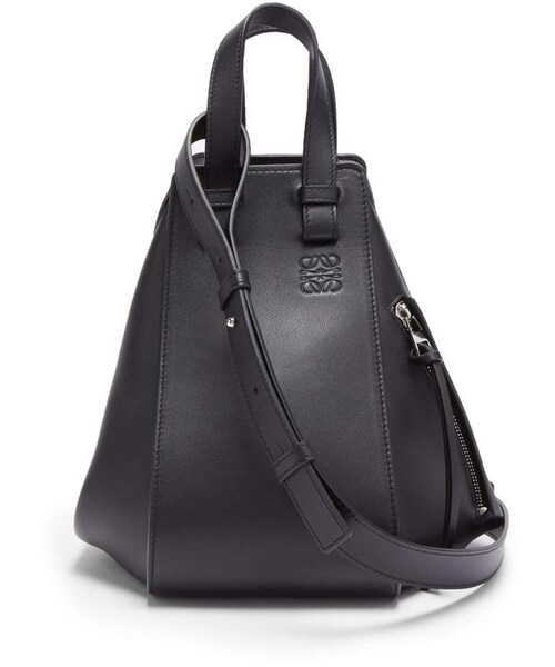 Loewe's coveted Hammock tote brings a sculptural element to your wardrobe. This black style is made in Spain from smooth leather accented with silver-tone metal hardware in the form of zips on the expandable side panels. It has an open top with a hook fastening on the inside which is lined with black herringbone canvas. Position it against architectural silhouettes for a contemporary look.