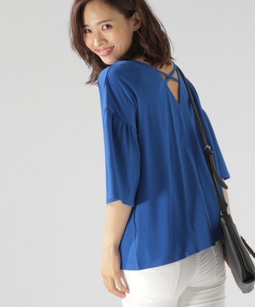 レーヨン混で光沢のあるカットソー素材を使用したデザイントップス。バックディティールの深めに取ったVラインとクロステープがアクセントです。