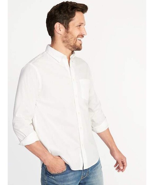 2% spandex, 98% cotton . Machine wash. Imported. Pointed, button-down collar. Long sleeves, with buttoned cuffs and buttoned sleeve plackets. Seven-button placket. Patch pocket at chest. Soft cotton with comfortable stretch. Engineered with innovative Built-In Flex stretch technology. Equal parts comfort & movement. Slightly fitted through body. Shirt hits below waist. Model is approximately 6'1" and wears a size M.