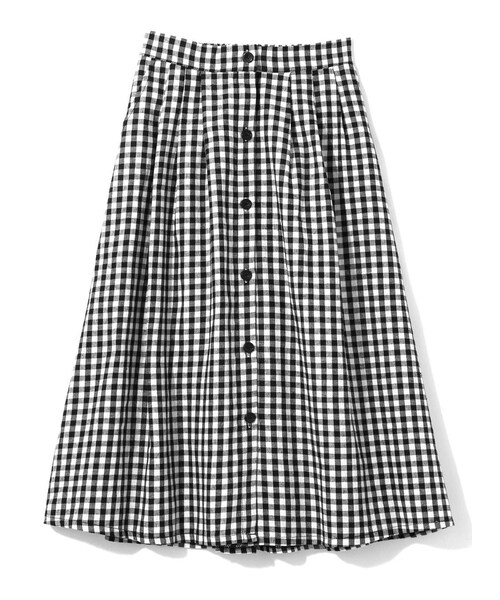 大人ガーリーに仕上がるギンガムチェック柄のスカート。 フロントに配したボタンがカジュアルな雰囲気に。 腰回りはすっきりしたデザインなので、ハイウエストに着てもすっきりまとまる。 タックでゆるやかに広がるフレアシルエットがレディライクな印象をプラス。 落ち着きのあるミモレ丈で、子供っぽくならないのも魅力的。 ★裁断の関係で、柄の出方が写真と多少異なる場合があります。 ★バックウエストゴム入りです。
