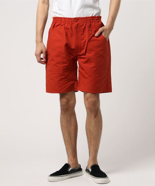 ナイロン混コットンのタフなグログラン生地で仕立てたヘビロテOKのショーツ。フロント側は縦長のビッグポケット、バックは挟みタグ付きのスクエアポケットがアクセントになっています。ウエストは楽に穿ける総ゴム仕様。ボタンは本体と同色ですっきりと馴染ませました。