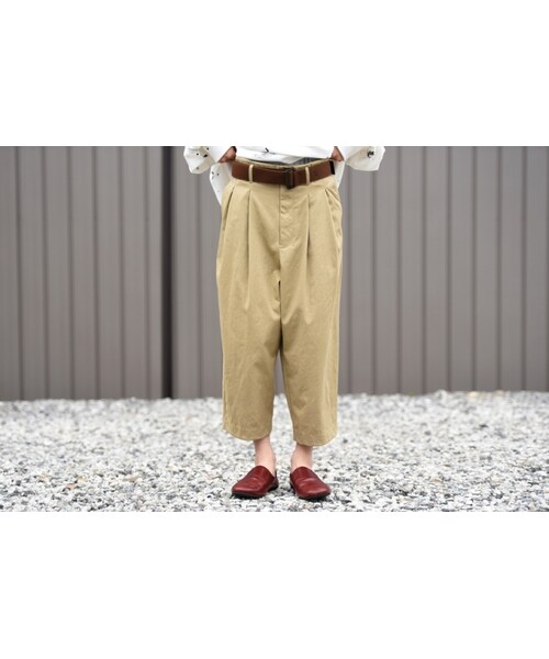 クロップド丈のタックパンツ。 ワイド過ぎない履きやすさを備えた夏に相応しい一本。 太もも周りをゆったりととりながら、裾に向かって綺麗に収まるテーパード仕様。 生地にはしなやかな程よいハリのあるナイロン素材で、存在感あるドレープが綺麗に表現されるものを使用。 肌触りの良さ、見た目の高級感が非常に魅力。 メンズ・レディース問わずユニセックスにオススメ。