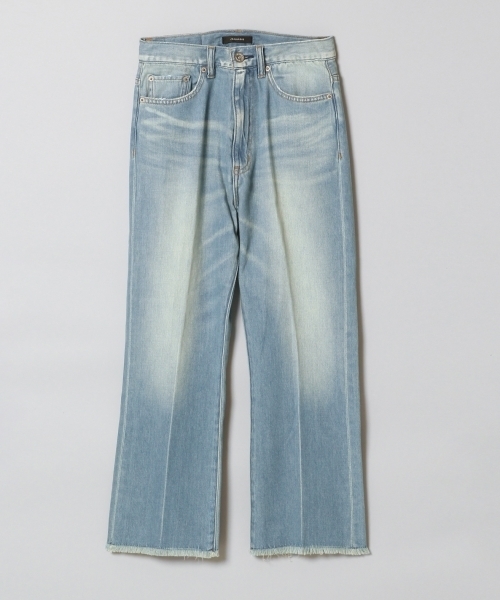 USED感をより意識した加工デニム☆ 裾やポケットにダメージ加工、フロントにはブラスト加工を施し、雰囲気のあるデニムパンツに仕上げました。 裾に向かってさりげなくフレアになっていて着用した時のシルエットも◎ Tシャツやフーディ等のカジュアルアイテムに合わせたシンプルスタイルや、 甘めトップスと合わせたMIXスタイルもおすすめです。