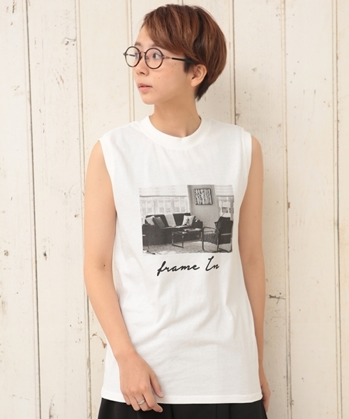 ノスタルジックなフォトプリントで大人目なノースリT。夏終わりにもカーデ合わせで使いやすいアイテムです。