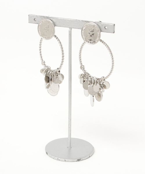 メタルパーツにコインパーツを混ぜ合わせた2way仕様のイヤリング。異なる質感のメタルパーツを使用しボリュームをプラス。 さりげなく混ぜたコインパーツがどこかヴィンテージ感がありトレンド感を感じさせます。 リング部分を取って、ワンポイントイヤリングとしても使用できるのも嬉しいポイント。