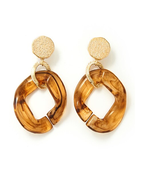 天然石のようなマーブルカラーがニュアンスのある耳元を演出するピアス。 フェイスラインに揺らめくモチーフは小顔効果も◎。 繊細な加工を施したゴールドパーツを合わせてリッチムードをプラス。 存在感のある大きさだから、コーデのアクセントにピッタリ。 デイリーにはもちろん、パーティーシーンにもマッチするアイテム。 ★素材の特性上、カラーが、写真と多少異なる場合があります。 ★金属アレルギーの方にもお使いいただけるよう低アレルギー素材のチタンポストとシリコンキャッチ使用です。(※チタンは比較的金属アレルギーを起こしにくい素材とされていますが、すべての方にアレルギー反応がでない事を保証するものではございません)
