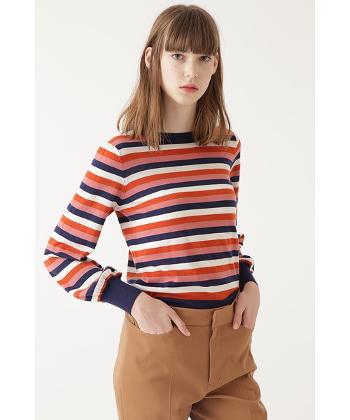 紗栄子さん着用 AUTUMN/WINTER ブランドムック掲載ハイゲージでさらりとした着心地が、大人らしいデザインニット。少し長めのリブ袖に、ゴールドカラーの釦デザインが、さりげない袖コンシャスなポイントに。襟ぐりや身頃はシンプルにして、すっきり着られるので、ジャンスカのインにも、ボトムインまで着まわし力の高い一枚です。