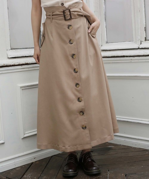 ~NICECLAUP 2018 AUTUMN Collection~大人めな印象のロングスカート。前ボタンデザイン×ロング丈で動くたびに揺れる裾がレディな雰囲気に。太めのベルトがセットになっているので、腰位置を高く見せてくれてロング丈でもスッキリとした印象になります◎着心地もウェストのうしろ部分が太めのゴムになっているので楽ちん♪ポケットにもボタンが付き、細部までおしゃれなアイテムです。■スタイリングクラシカルな雰囲気でまとめるならブラウス合わせがおすすめ。フリルが付いていたり、レース使いになったブラウスでぜひコーデして◎シンプルなTシャツやボーダーカットソーで合わせてスニーカーを履けばこなれ感が出ます。アウターはGジャンやライダースがおすすめ。