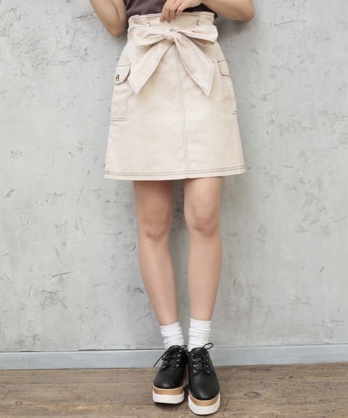 ~NICECLAUP 2018 AUTUMN Collection~美シルエットの台形ミニスカートが登場!配色ステッチを効かせたシンプルかつポイントの効いたスカート。大きめのポケットはボタンがついていて細部まで可愛く、スマホもはいるサイズ感で機能性も◎取り外しのできる大きめのリボンは腰位置を高く見せてくれるのでスタイルアップを叶えてくれるます。後ろは太めのゴムでファスナーがついているので着用も楽ちんです♪■スタイリング合わせるトップの色によって夏っぽくも秋っぽくもなるので、使える期間が長いのも嬉しいポイント♥ヴィンテージ感のあるブラウスやスポーティーなトレーナーやパーカーまでジャンルの幅も広く、着回し力抜群◎ワントーンコーデもしやすいので、ベージュコーデやモノトーンコーデもおすすめ!