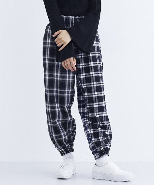 4面全て違うパターンのチェック柄をドッキングした個性的なパンツ。 足首を裾ゴムでキュッと絞った可愛いコクーンシルエットが魅力的。 遊び心のある素材使いで飽きのこないアイテムです。 ・ウエストオールゴム仕様