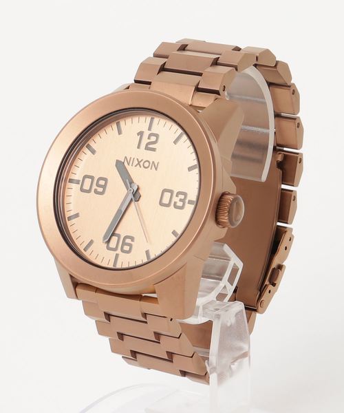 定番であるTHE CORPORALのステンレスバンド ファンの中でも着用率の高いTHE CORPORAL SS(コーポラルSS)。大振りなダイアル、滑らかな曲線、そしてミリタリーにインスパイアされたディティールが特徴で、ステンレスバンドがあなたの魅力をさらに引き出すはず。インデックス、数字、長針、短針、秒針をバランスよく配置したシンプルな文字盤デザインは抜群の視認性を誇り、まさに「時を刻む」という時計本来の役目にフォーカスしたミニマルでシンプルなデザインとなっています。中でも、時刻を表す数字に0を加えている点や、ステンレススチールのベゼルの内側に角度をつけている点など、シンプルながらもNIXONらしい遊び心を表現している。