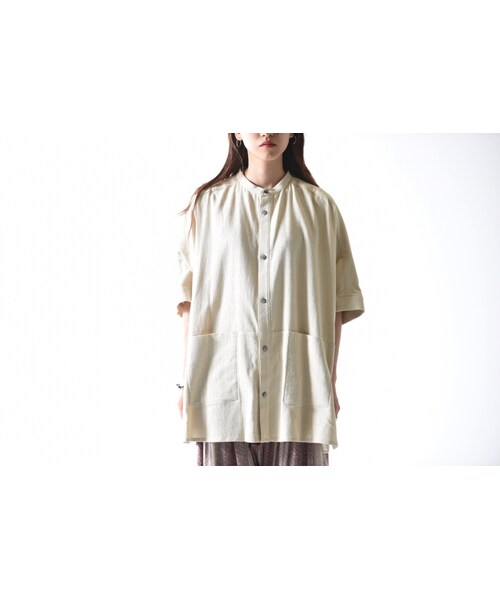 別名梨地織りと呼ばれるアムンゼン組織のコットン100%のオリジナル生地を使用したボックスシャツ。 ザラついた表面で肌へのタッチも良い通年で使用出来るのも魅力の一つ。 YANTORを語る上で欠かせない平面立体の技法で、袖と身頃が一体化しており、スクウェアを意識した独特のフォルムと切り替え部のポケットもディテールポイントの一つ。 ユニセックスブランドらしく男性女性どちらが着ても違和感の無いアイテムです。