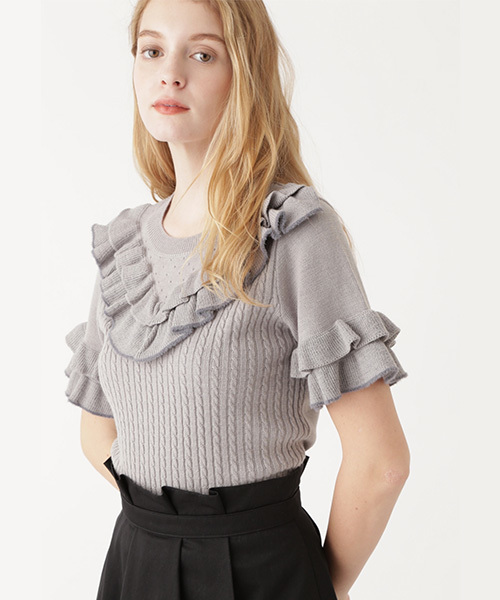 前身頃と袖口にラッフルをあしらい、正面にボリューム感を持たせたニットトップス。襟もとはアイレット、ボディの編地はケーブル編みを切替え、一枚で存在感のあるデザイン。JILLらしいテクニックが可愛らしく、チェックやツィード、無地ボトムまで相性良く、レトロフェミニンなスタイリングが完成します。