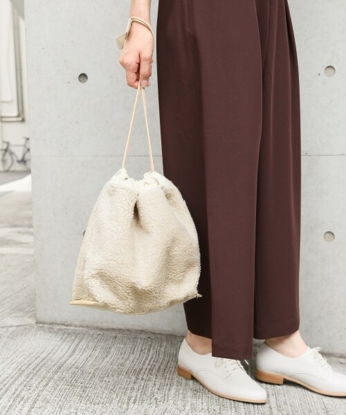 秋に向けての気分を盛り上げてくれるボアとポイントになるガラのラフにもっていただける巾着BAGです。ボリューム感あるサイズなのでシンプルなスタイリングのアクセントにも◎